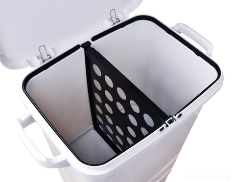 W środku górnego kosza dzieląca wyjmowana przegroda z plastikowymi uchwytami dla przytrzymania worka na śmieci....