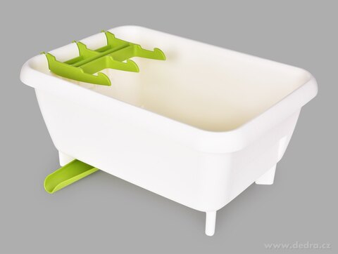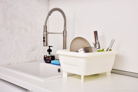 Suszarka do naczyń z rynną i ze składanym uchwytem na kubki oraz sztućce. Wykonano z trwałego plastiku. Wymiary: 36 x 25 x 17 cm.