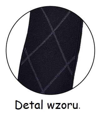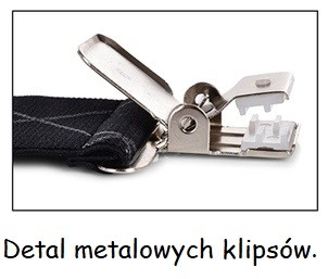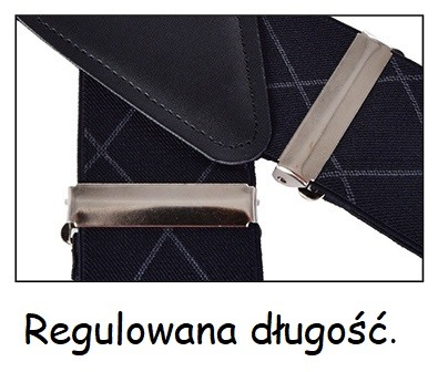 Szerokie szelki X z mocowaniem na metalowe klipsy, środek z ekoskóry, czteropunktowe, szeroki elastyczny pasek o szerokości 5 cm dla wygodnego noszenia. Regulowana długość. Maksymalna długość to ok. 120 cm (w stanie nienapiętym).