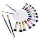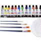 12 odcieni farbek dekoracyjnych do szkła (lekko przezroczyste, szybko schnące), na bazie wody, 4 pędzle różnej wielkości i 1 plastikowa paleta do mieszania kolorów. Wymiary: pojemność jednej farby 12 ml, długość pędzelków 17 cm, 19,5 cm, 21 cm i 22,5 cm, średnica palety 14 cm. Opakowanie 27 x 2,5 x 18 cm.