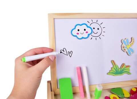 3w1 stołowa dwustronna tablica magnetyczna, naturalnie drewniana. Wymiary: 29 x 22 x 3 cm (rozłożona 18,5 cm), obszar rysowania 24 x 17 cm.