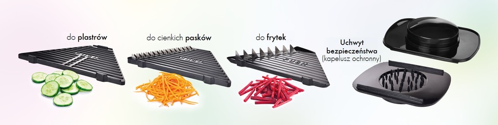 3 wymienne plansze do krojenia w plastry, paski i frytki.