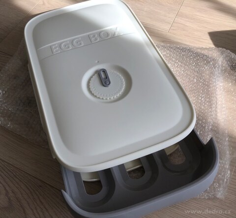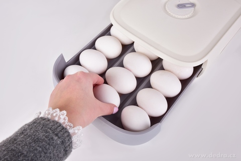 Szuflada z praktycznymi szynami dla łatwego wyjmowania jajka jednym ruchem = następne jajo samo przesunie się w miejsce poprzedniego.