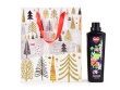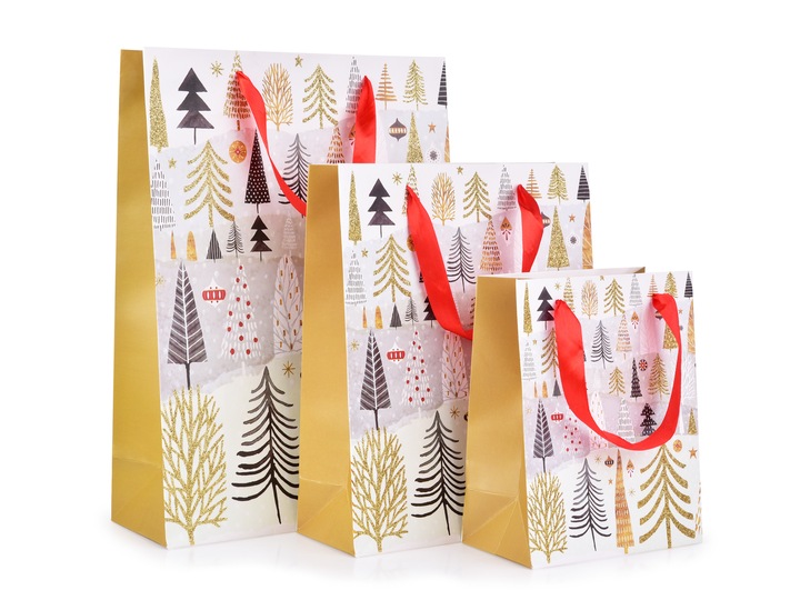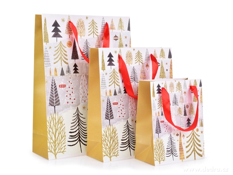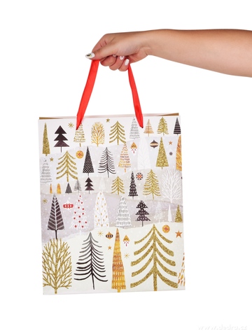 Torebka na prezent, motyw ozdobiony złotym brokatem | choinki, rozm. L
