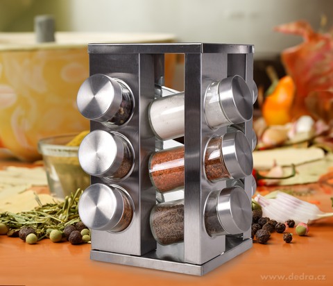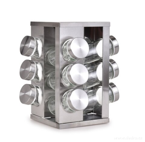 KARUZELA NA PRZYPRAWY, obrotowy stojak ze szczotkowanej stali nierdzewnej, ze szklanymi słoiczkami. Stojak 12,5 x 12,5 x 22 cm, przyprawnik: średnica ok. 4 cm x wys. 9,7 cm (pojemność jednego słoiczka ok. 90 ml).