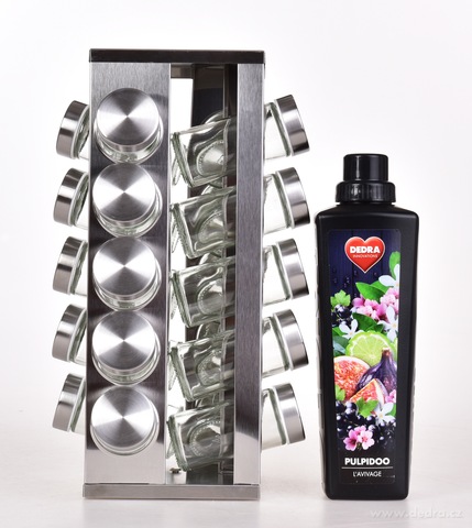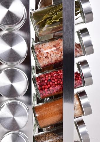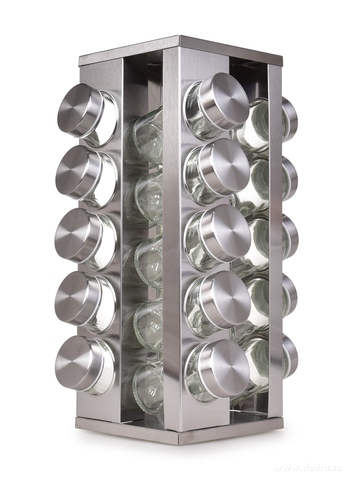KARUZELA NA PRZYPRAWY, obrotowy stojak ze szczotkowanej stali nierdzewnej, ze szklanymi słoiczkami. Stojak 12,5 x 12,5 x 32,5 cm, przyprawnik: średnica ok. 4 cm x wys. 9,7 cm (pojemność jednego słoiczka ok. 90 ml).