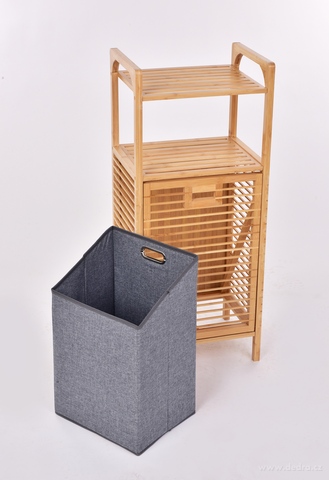BAMBUSOWY REGAŁ z odchylanym koszem na pranie z tkaniny szary melanż, na górze dwie bambusowe półki.