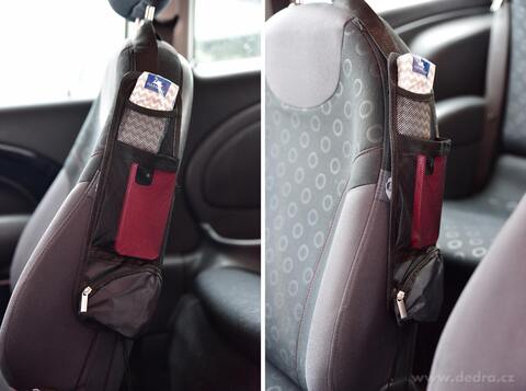 Wiszący kieszonkowiec/ organizer do samochodu na bok siedzenia, łatwe mocowanie dzięki paskowi na rzep i sznurkowi w dolnej części.