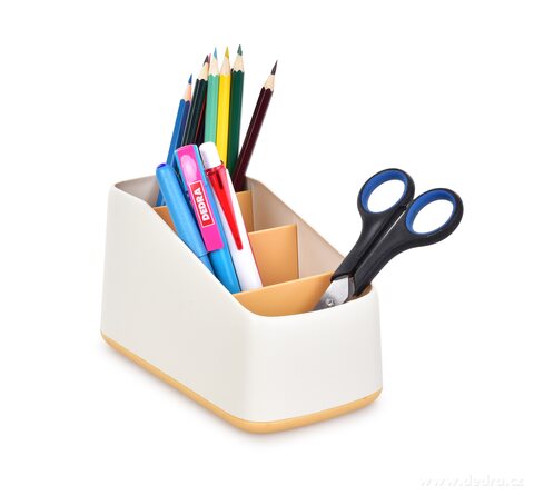 Organizer biurowy z czterema przegródkami do przechowywania długopisów, ołówków, karteczek, kalkulatora, nożyczek oraz innych artykułów piśmiennych. Wykonano z solidnego plastiku.