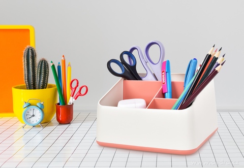 Organizer biurowy z czterema przegródkami do przechowywania długopisów, ołówków, karteczek, kalkulatora, nożyczek oraz innych artykułów piśmiennych. Wykonano z solidnego plastiku.