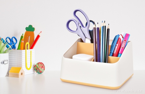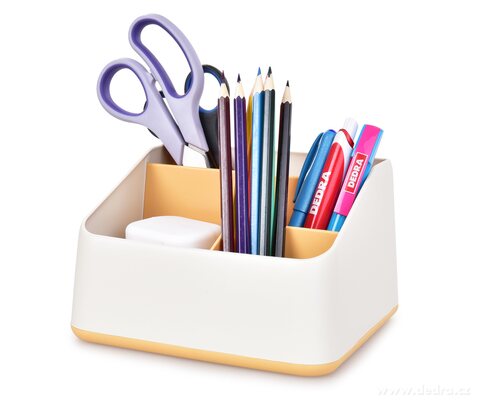 Organizer biurowy z czterema przegródkami do przechowywania długopisów, ołówków, karteczek, kalkulatora, nożyczek oraz innych artykułów piśmiennych. Wykonano z solidnego plastiku.