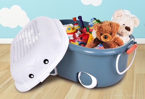 Mobilny pojemnik dziecięcy z pokrywką, uchwytem i 4 kółkami dla łatwej manipulacji. Wykonano z solidnego plastiku.