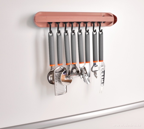 Wieszak z 8 haczykami do powieszenia różnych przyborów kuchennych, wykonany z solidnego plastiku.
