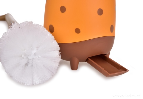 Szczotka do WC z motywem żyrafy. Wykonano z solidnego plastiku. Wymiary: stojak- średnica dolna 11 cm (górna 9 cm) x wys. 13,5 cm, szczotka- średnica 7,5 x wys. 48 cm, wysokość całkowita 51 cm.