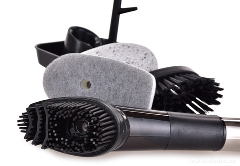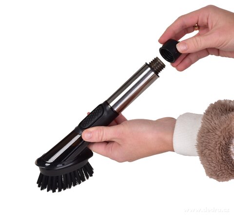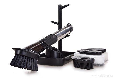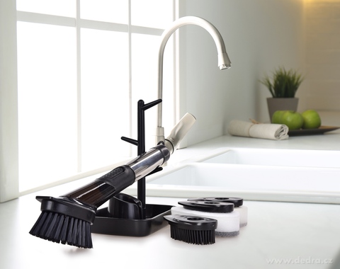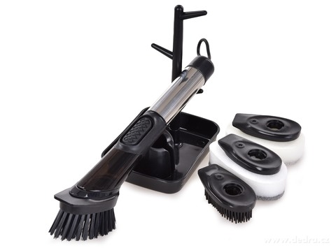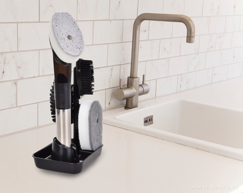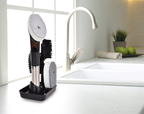 4w1 zestaw dozujących szczotek i gąbek AQUATIX. W komplecie stojak, uchwyt z dozownikiem + 4 nakładki (szczotka silikonowa, szczotka nylonowa, miękka gąbka celulozowa, szorstka gąbka). Połączenie stali nierdzewnej, plastiku i TPR.