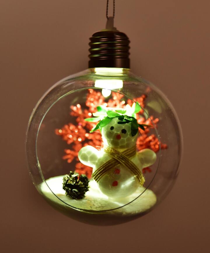 Transparentna bombka LED z zimową scenerią w środku – bałwanek z szyszką na tle brokatowej śnieżynki. Kolorowo świecąca dekoracja o średnicy 8 cm rozświetli wnętrze oraz świąteczną atmosferę.