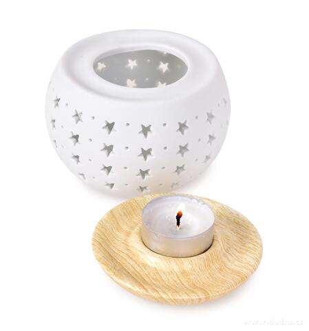 Ceramiczna aromalampa na pogrzewacze typu tealight, na podstawie imitującej drewno, ze zdobieniem w gwiazdy i matową białą glazurą.