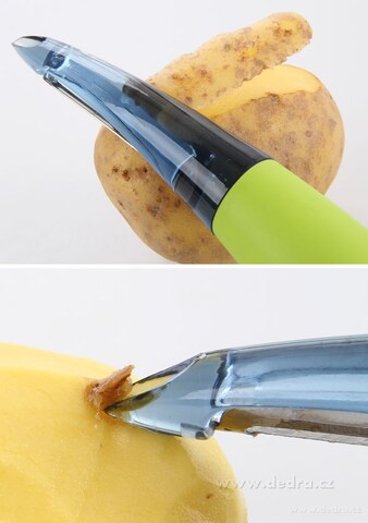 Obieraczka z obrotowym, japońskim ostrzem. W górnej części znajduje się specjalna końcówka do usuwania oczek z ziemniaków. Nadaje się do wszystkich rodzajów warzyw i owoców, które się obiera. Posiada otwór do powieszenia. Wykonana z twardego tworzywa sztucznego, ostrze ze stali nierdzewnej, uchwyt pokryty powłoką antypoślizgową, miłą w dotyku.