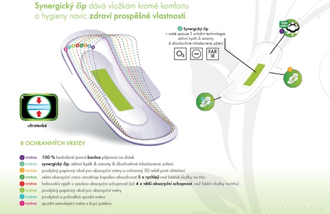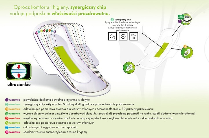 Podczas opracowywania chipa synergistycznego osiągnęliśmy technologiczne połączenie pozytywnych właściwości technologii FAR-IR, technologii anionowej oraz aktywnego tlenu, przez co podpaski POMPADOUR® zajmują obecnie najwyższą pozycję technologiczną.