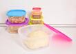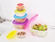 Praktyczny zestaw 7 plastikowych pojemników z kolorowymi pokrywkami do przechowywania, przenoszenia oraz mrożenia żywności. Oszczędnie składają się jeden w drugi, nadają się do zmywarki, mikrofalówki i zamrażarki – idealne do diet pudełkowych oraz domowego przechowywania.