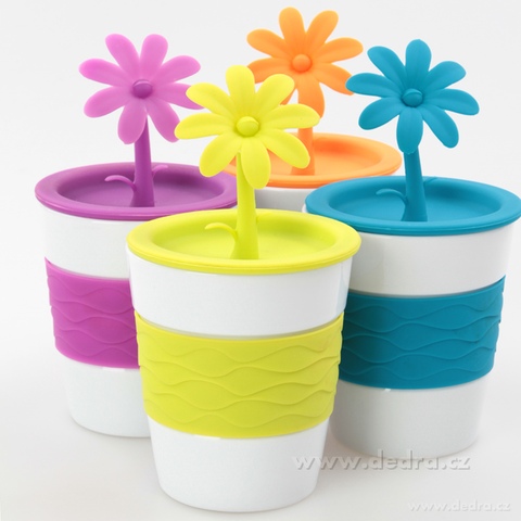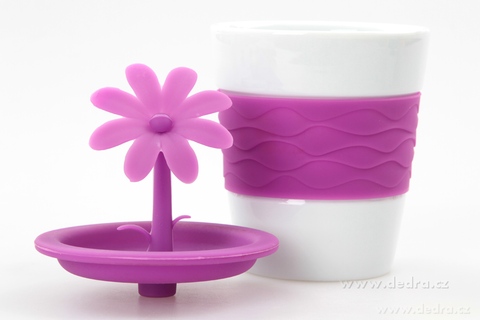 Kubek z silikonowym paskiem (nie wypadnie z ręki, nie poparzysz się gorącym kubkiem) silikonowe wieczko ozdobione kwiatkiem. Wieczko sprawdzi się również jako miejsce na torebkę herbaty. wysokość: 17 cm, objętość 280 ml.