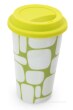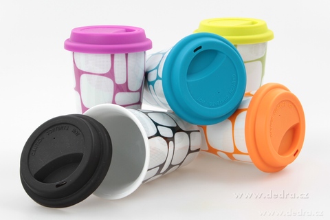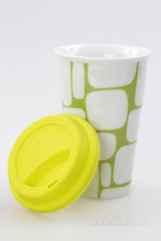 Kubek termiczny z podwójnymi ściankami, wykonany z porcelany z pokrywką silikonową, wysokość 15 cm, pojemność 275 ml.