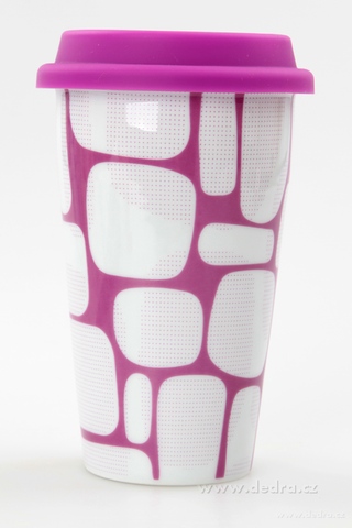 Kubek termiczny z podwójnymi ściankami, wykonany z porcelany z pokrywką silikonową, wysokość 15 cm, pojemność 275 ml.