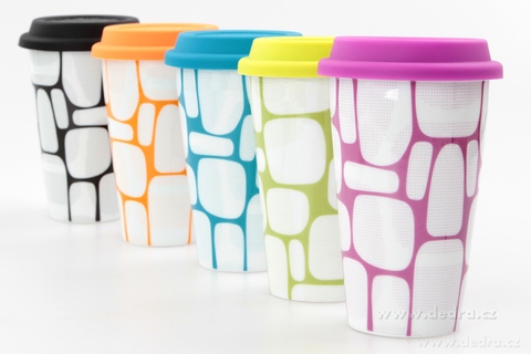 Kubek termiczny z podwójnymi ściankami, wykonany z porcelany z pokrywką silikonową, wysokość 15 cm, pojemność 275 ml.