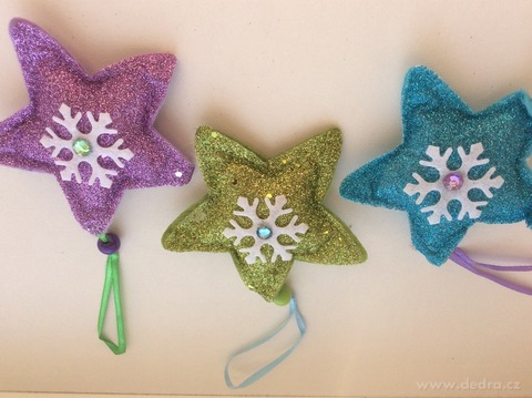 3 wiszące serduszka z błyszczącego materiału. Łączna długość około 15 cm (z zawieszką).