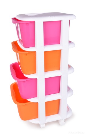QUATRO czteropiętrowy regał z utwardzonego plastiku. Posiada kółka dla prostej manipulacji.