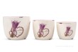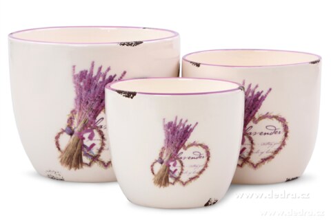 Zestaw 3 donic ceramicznych, z motywem lawendy i napisami – połyskujące, celowo "uszkodzone" z matową podstawką ceramiczną