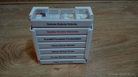 W stojaku jest 7 oddzielnych pojemników na każdy dzień z oznaczeniem (poniedziałek-niedziela).