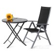 Stolik nadaje się do ogrodu lub patio Wykonany z ciemnego szkła i aluminium Wymiary: średnica 70 cm, wysokość 71,5 cm