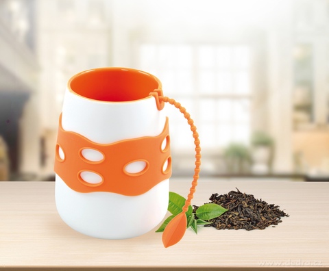 i silikonowym woreczkiem na herbatę liściastą w kolorze pomarańczowym.