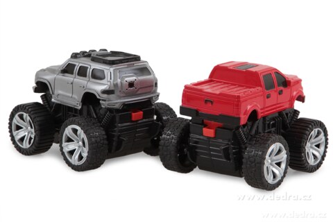 OFF-ROAD JEEP (2 w zestawie), 2 samochodziki typu SUV z wysokim podwoziem. Samochód posiada koło zapasowe, które łatwo zmienić.