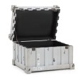 Drewniana skrzynia zamykana metalową klamrą.