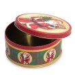 Metalowy, okrągły pojemnik ze świątecznym motywem.