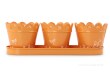 Zestaw 3 metalowych osłonek na doniczki na metalowej tacy. Pomalowane lakierem o wysokim połysku. W górnej części osłonki znajduje się wzór koronki. Osłonka ozdobiona jest ważką i roślinami w kolorze białym. Wymiary: 32,5 x 9,5 x 10,5 cm. Wymiary osłonki: średnica górna 10 cm, średnica podstawy: 7 cm