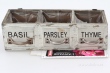 Dekoracyjny drewniany pojemnik na 3 doniczki. Postarzony, połączenie drewna i metalu Napisy BASIL (bazylia), PARSLEY (natka pietruszki), THYME (tymianek) Wielkość każdego otworu: 9.5 x 10 x 9.5 cm, wymiary całości: 32,5 x 11 x 10 cm.