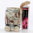 Drewniany dekoracyjny pojemnik w kształcie beczki na kółkach. Całość celowo postarzona, kombinacja drewna i skóry ekologicznej Rozmiar otworu: średnica 9,5 cm, wysokość: 17 cm, wymiary:. 12 x 20 x 26 cm