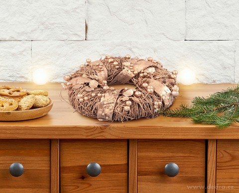 Złoty wieniec dekoracyjny z bogatymi zdobieniami.Średnica: około 23 cm