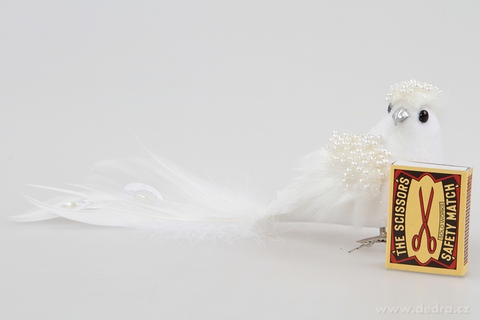 Duży słowik zdobiony delikatnymi piórami i perełkami.