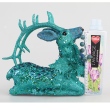 Jeleń z naturalnymi ozdobami, pokryty błyszczącymi cekinami.