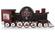 Duży metalowy zegar w stylu retro o wyglądzie lokomotywy parowej.