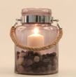Dymny odcień szkła, uchwyt wykonany z liny, miejsce na tealight lub klasyczną świecę. Kolorowe przezroczyste szkło.