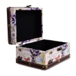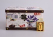 Dekoracyjna kasetka z romantycznym motywem, wykonana z drewna i ekoskóry, wyścielona tkaniną wewnątrz, zamykana na zatrzask metalowy.