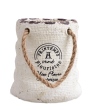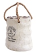 Masywne ozdobne naczynie wykonane z gliny w kształcie worka z uchwytem z liny.
