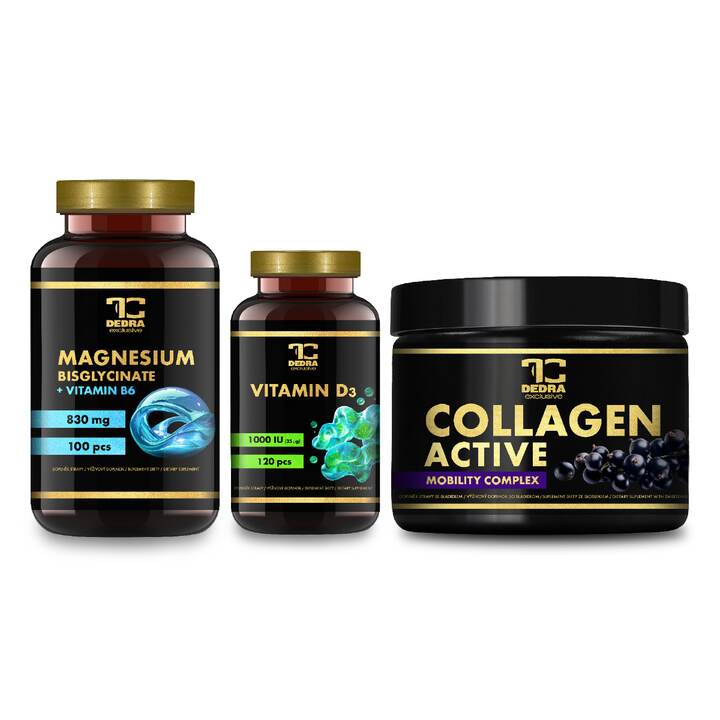 Pakiet z magnezem, witaminą D3 oraz napojem kolagenowym. Witamina D przyczynia się do prawidłowego funkcjonowania mięśni oraz do utrzymania prawidłowego stanu kości. Magnez przyczynia się do prawidłowego funkcjonowania mięśni oraz do zmniejszenia uczucia zmęczenia i wyczerpania. Witamina C wspiera prawidłową produkcję kolagenu dla prawidłowego funkcjonowania kości i chrząstek. Cynk pomaga w utrzymaniu prawidłowego stanu kości.