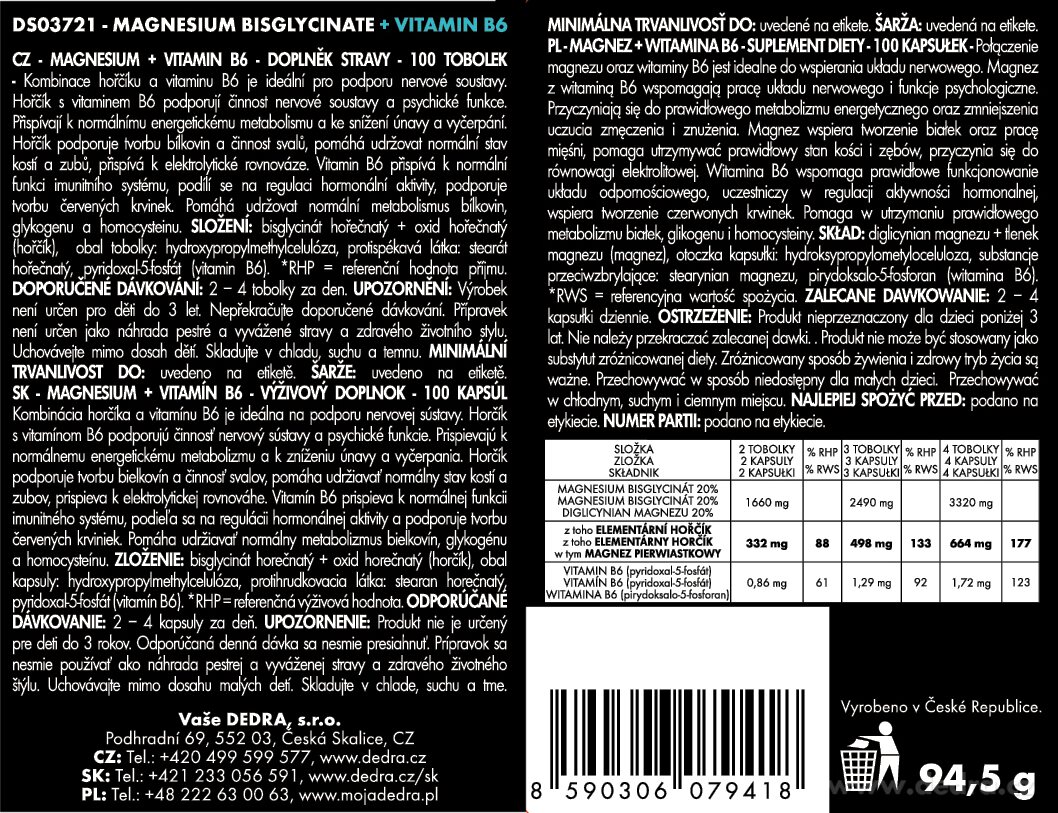 830 mg bisglicynian magnezu, w tym 166 mg magnez pierwiastkowy + 0,47 mg aktywna forma witaminy B6 w postaci P-5-P (pirydoksal-5-fosforan) w 1 kapsułce.