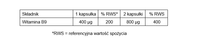 Zalecane dawkowanie: 1-2 kapsułki/dzień. W okresie ciąży zaleca się przyjmowanie 2 kapsułek dziennie, tj. 800 μg.